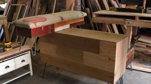 Earlier this fall, Habitat For Humanity featured Recycled Brooklyn’s work at the organization’s 30th anniversary gala at Cipriani Wall Street, Steve said, highlighting them as a builder working to reduce waste in the construction trade. At their Red Hook production space, Steven walked over to three pieces that were featured at the gala. One of the major hits, he said, was their coffee sack storage bench ($450). The seat is upholstered with used coffee bean sacks donated from local roasters like Cafe Grumpy, Oslo and Stumptown.